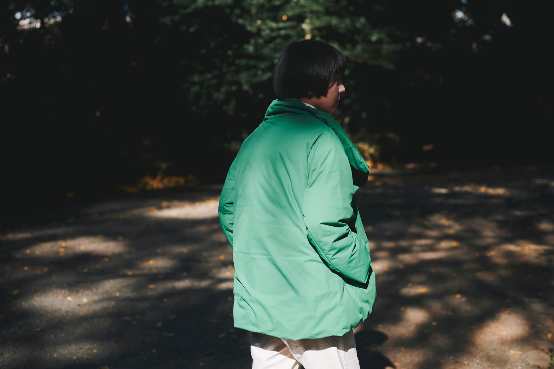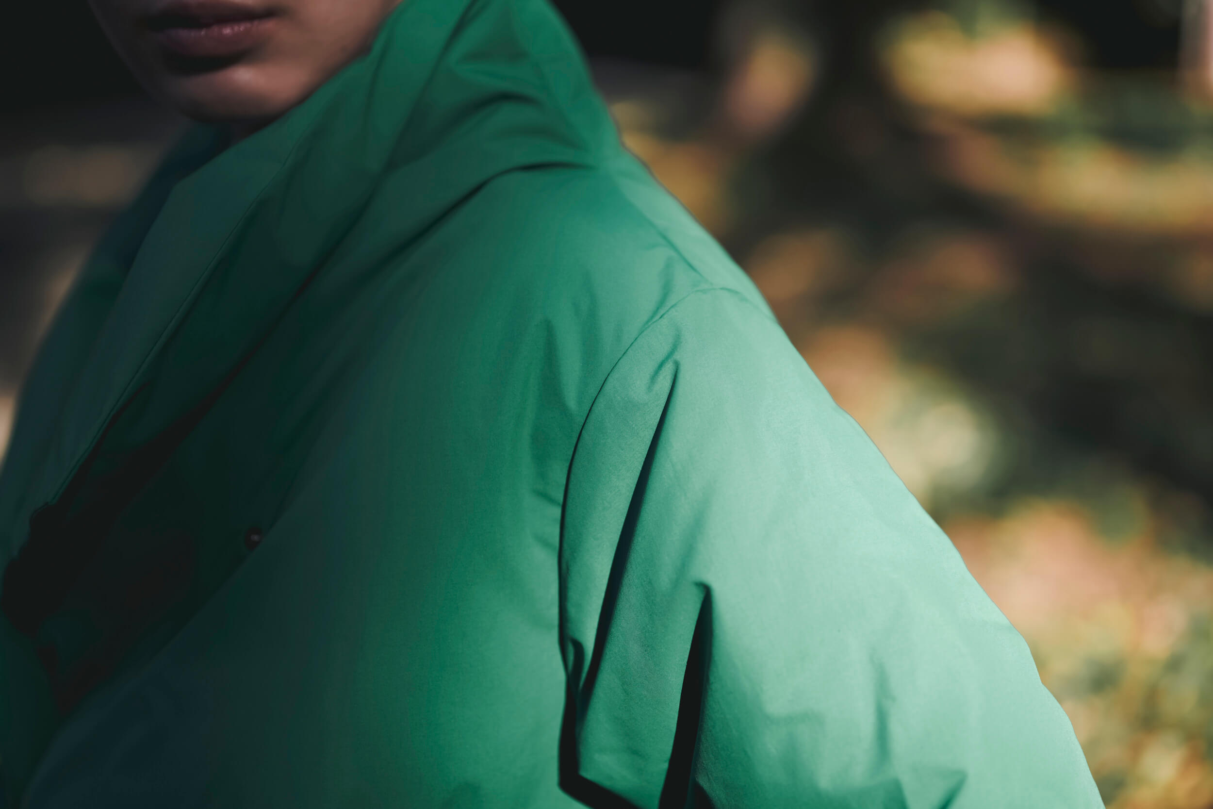 表地はポリエステルでありながら、コットンがもつ肌触りや質感を表現するために、糸に特殊な加工を施し、高密度に織り上げられています。裏地には、マットな質感となめらかなタッチが特徴の、ナイロンタフタを使用。袖を通したときの接触冷感を抑えた柔らかな着心地の素材です。