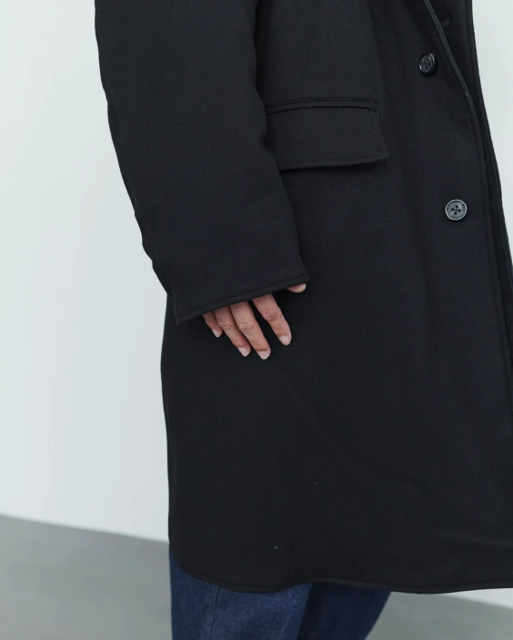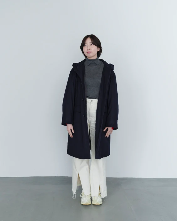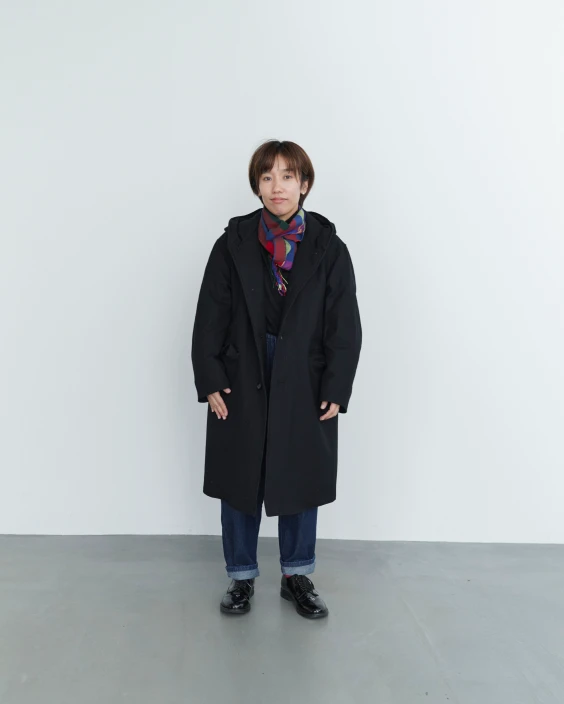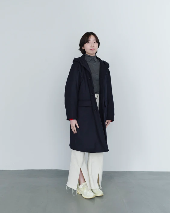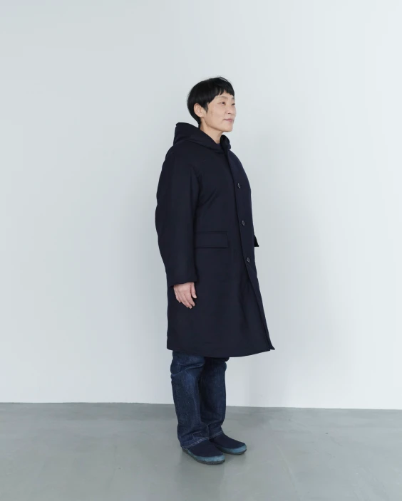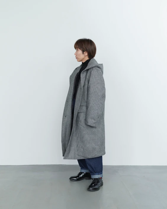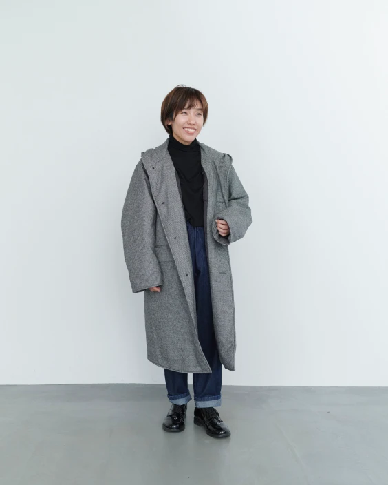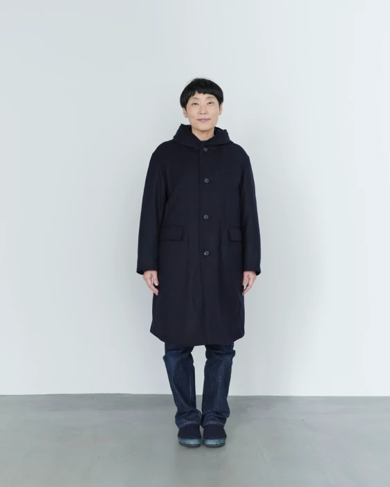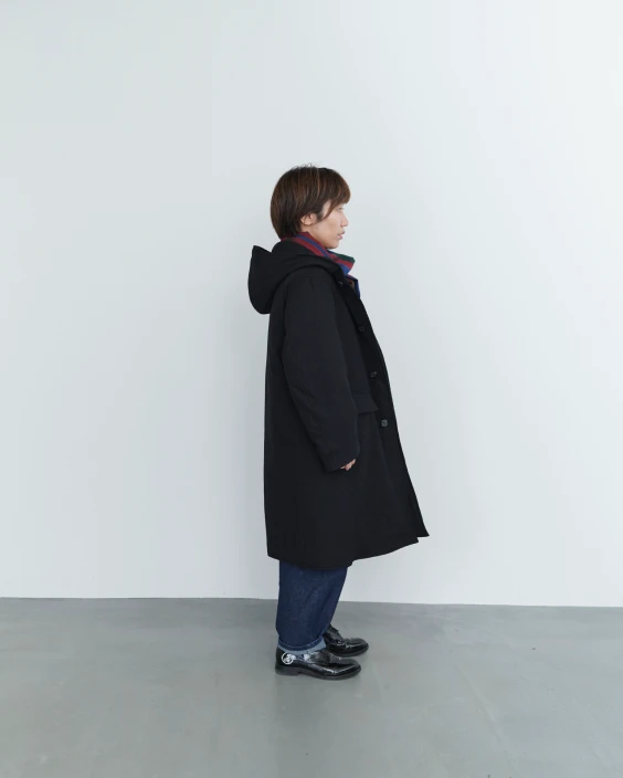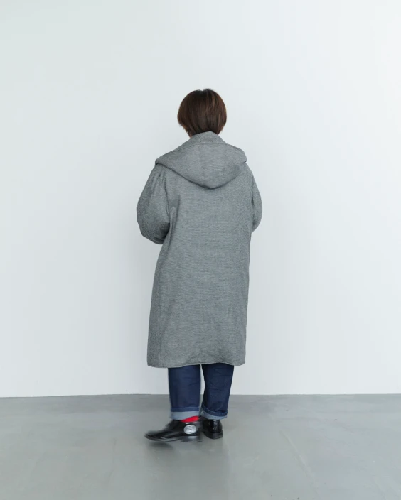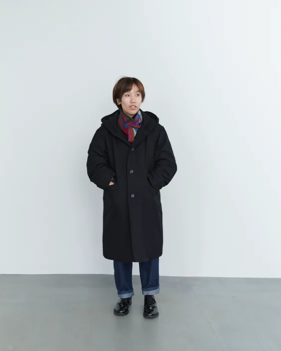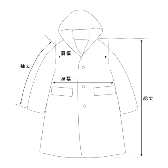 頭をすっぽり覆うほどの、大きなフードつき。フロントには大きめのボタンが4つ付いており、シンプルなデザインのアクセントになっています。