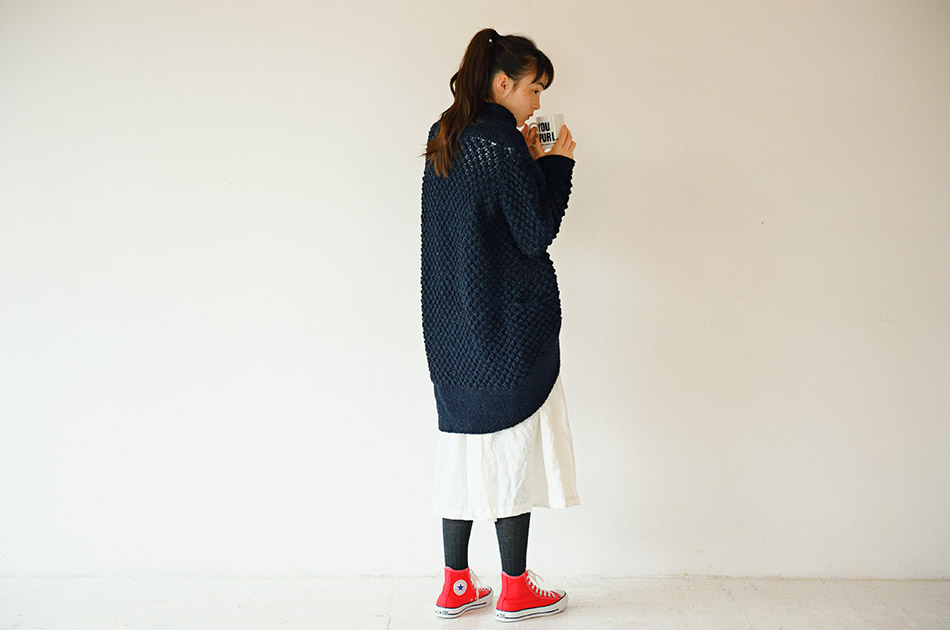 長めの丈ですっぽり包まれるような着心地です。