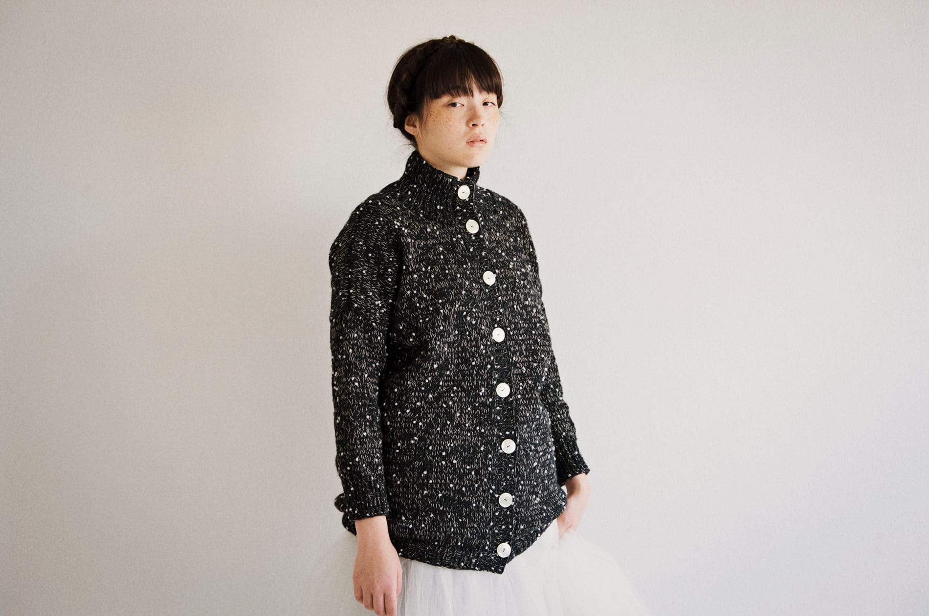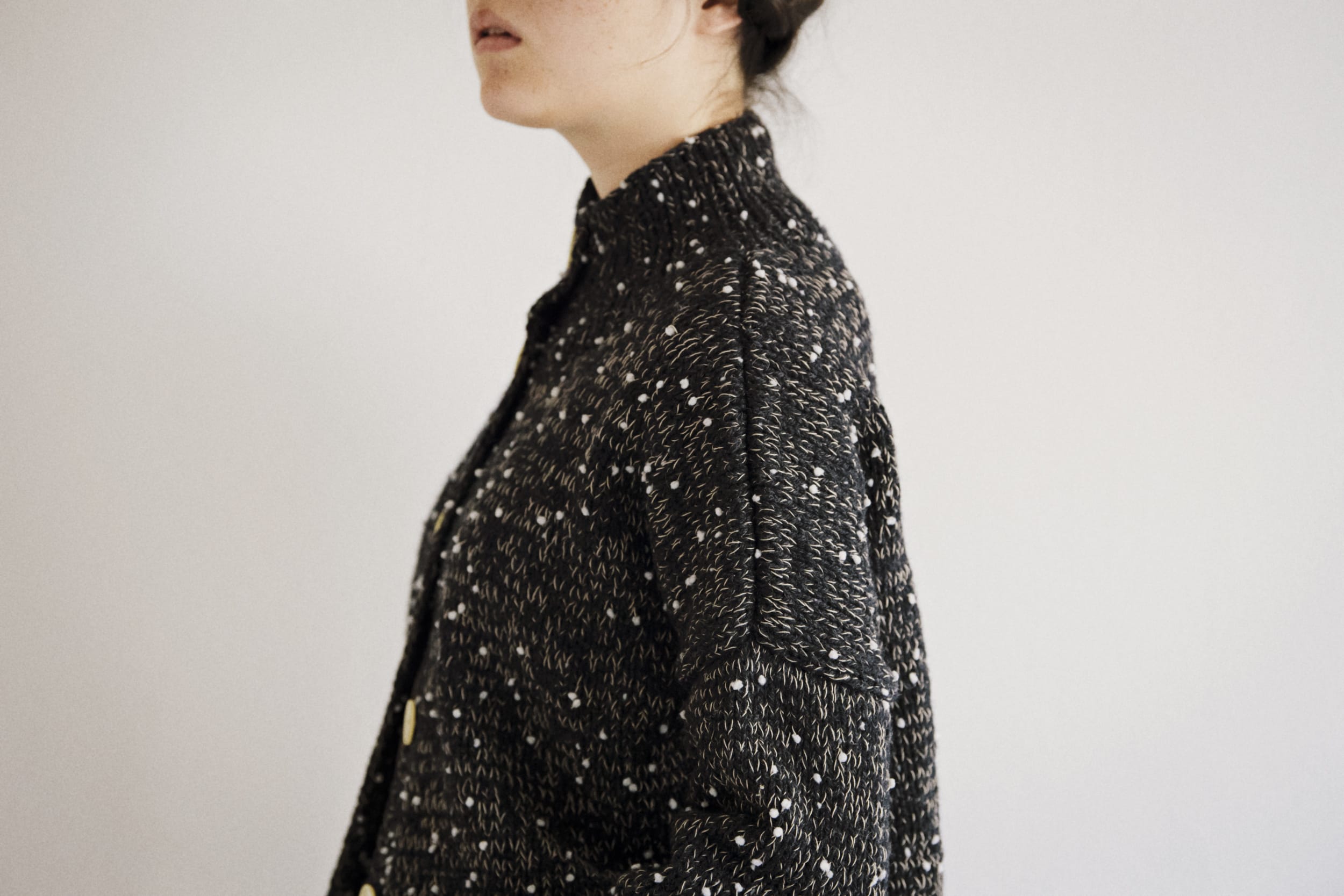 スタンドカラーにドロップショルダー、