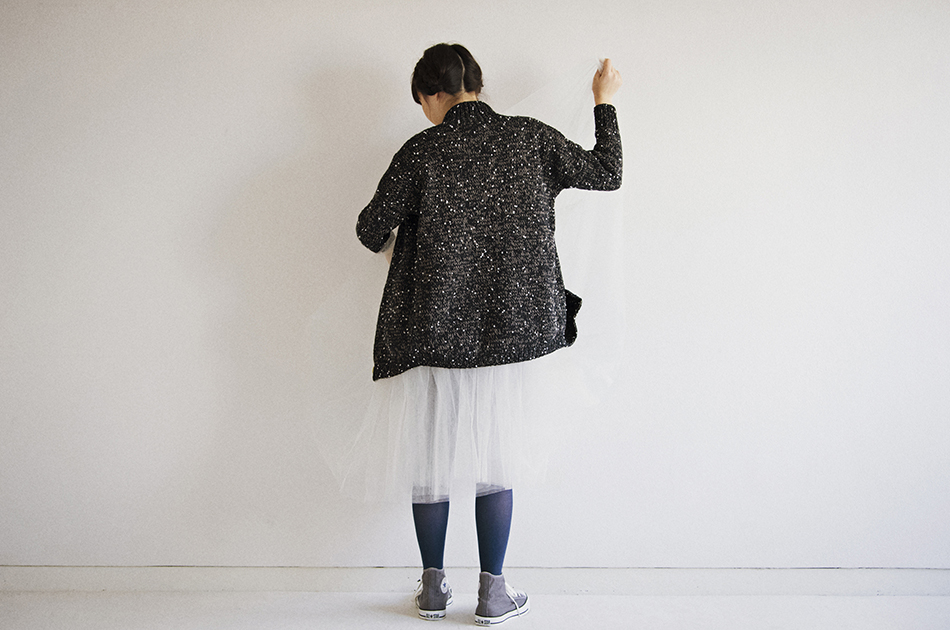 広めのドロップショルダーから続く袖はすっきりと。