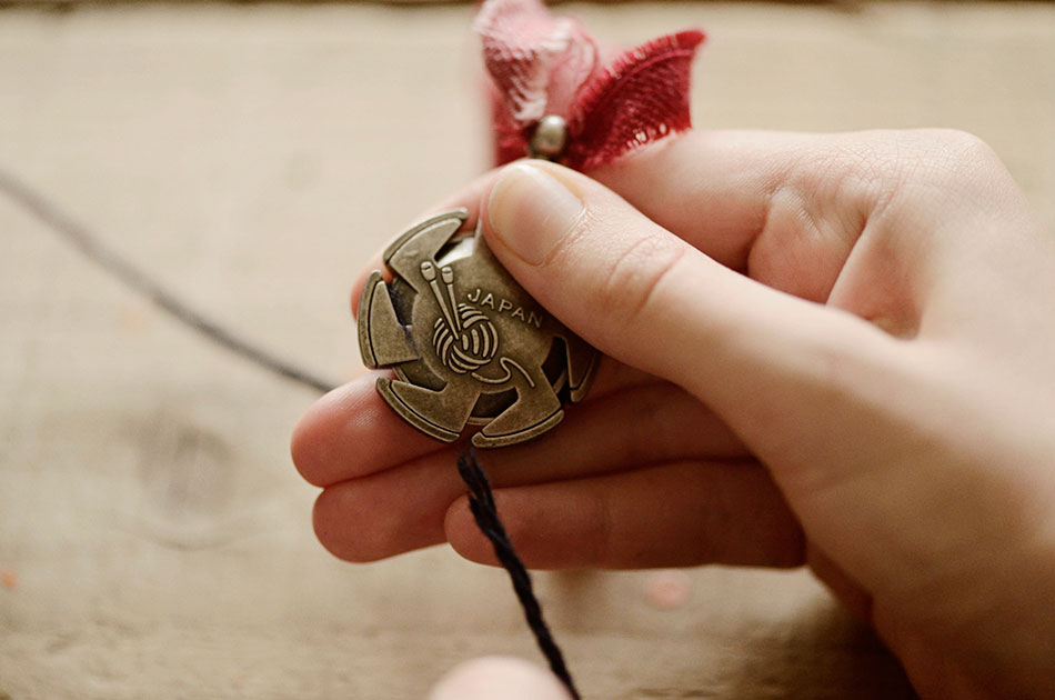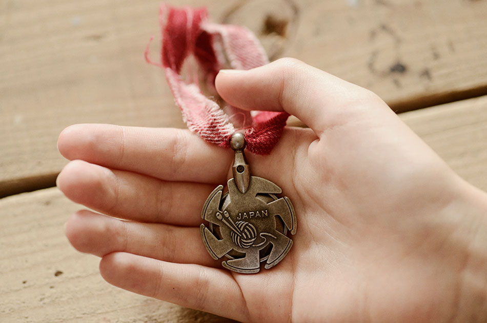 メダルのようなこのアイテムは、編み糸用のカッターです。
