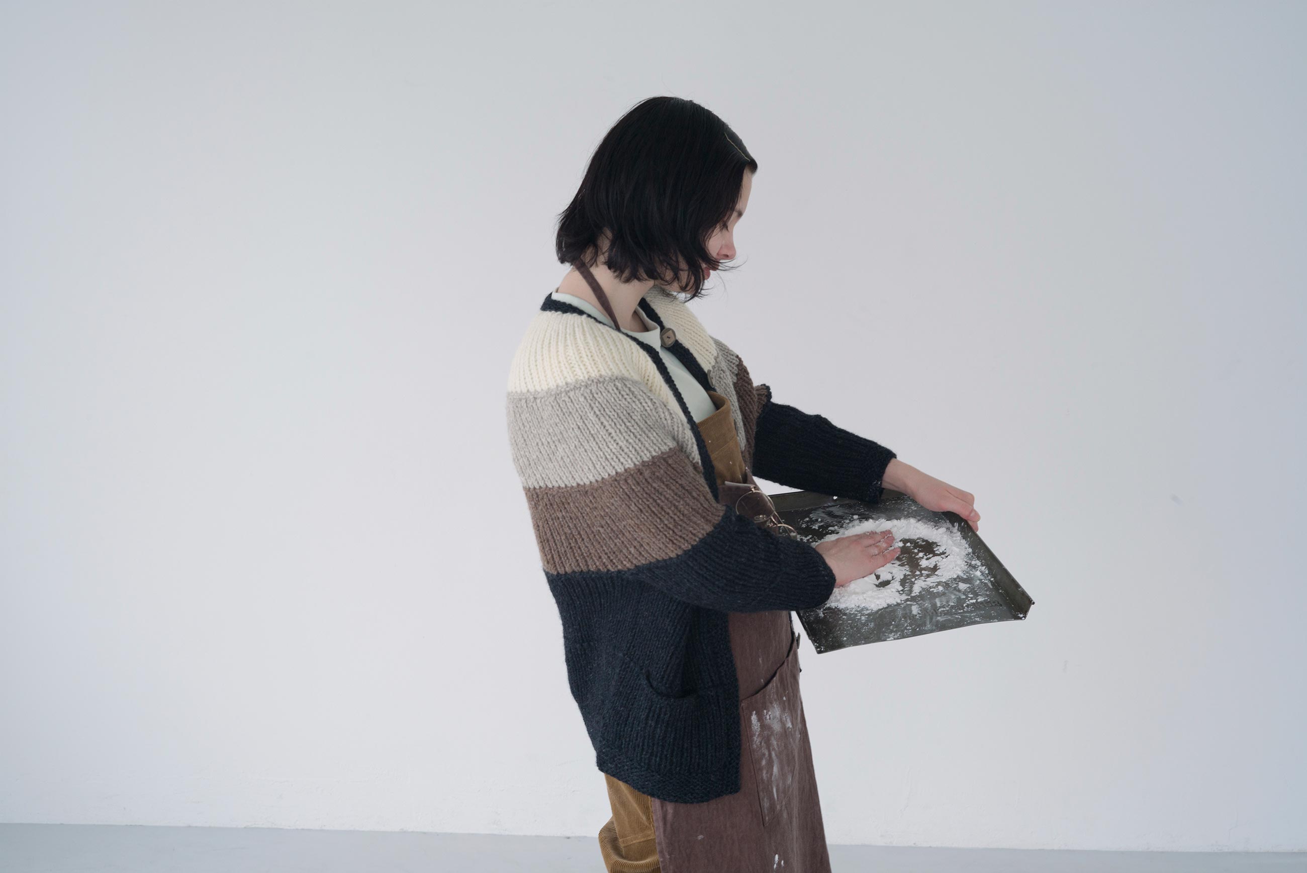 生成りには古着のカーディガンのボタンを参考につくった、