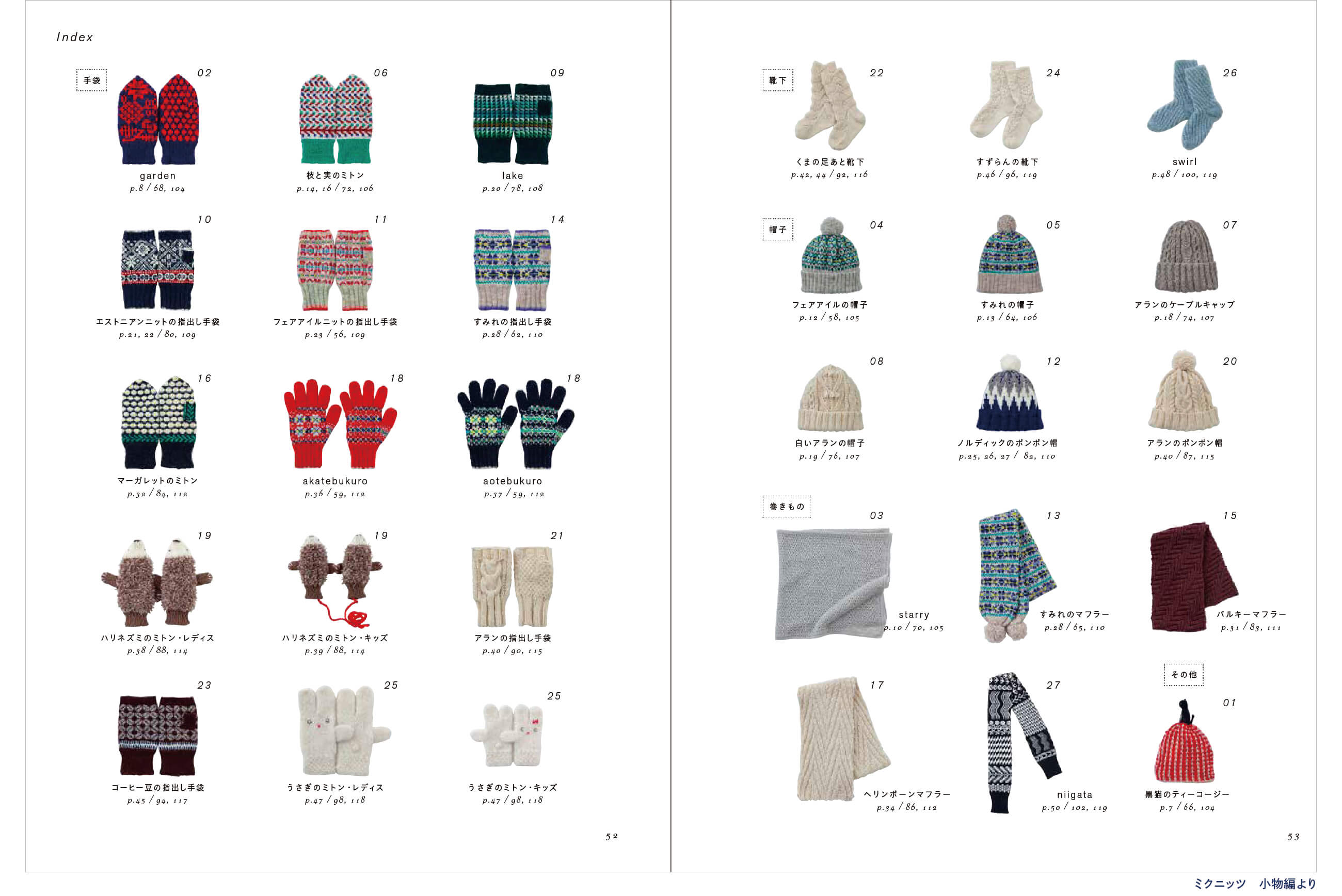 フェアアイルニットの指出し手袋/エストニアンニットの指出し手袋/アランの指出し手袋/アランのポンポン帽/バルキーマフラー/マーガレットのミトン/コーヒー豆の指出し手袋/くまの足あと靴下/枝と実のミトン/すみれのマフラー/黒猫のティーコージー/ノルディックのポンポン帽/ハリネズミのミトン/ヘリンボーンマフラー/アランのケーブルキャップ/garden/うさぎのミトン/lake/すみれの帽子と指出し手袋/starry/aotebukuro