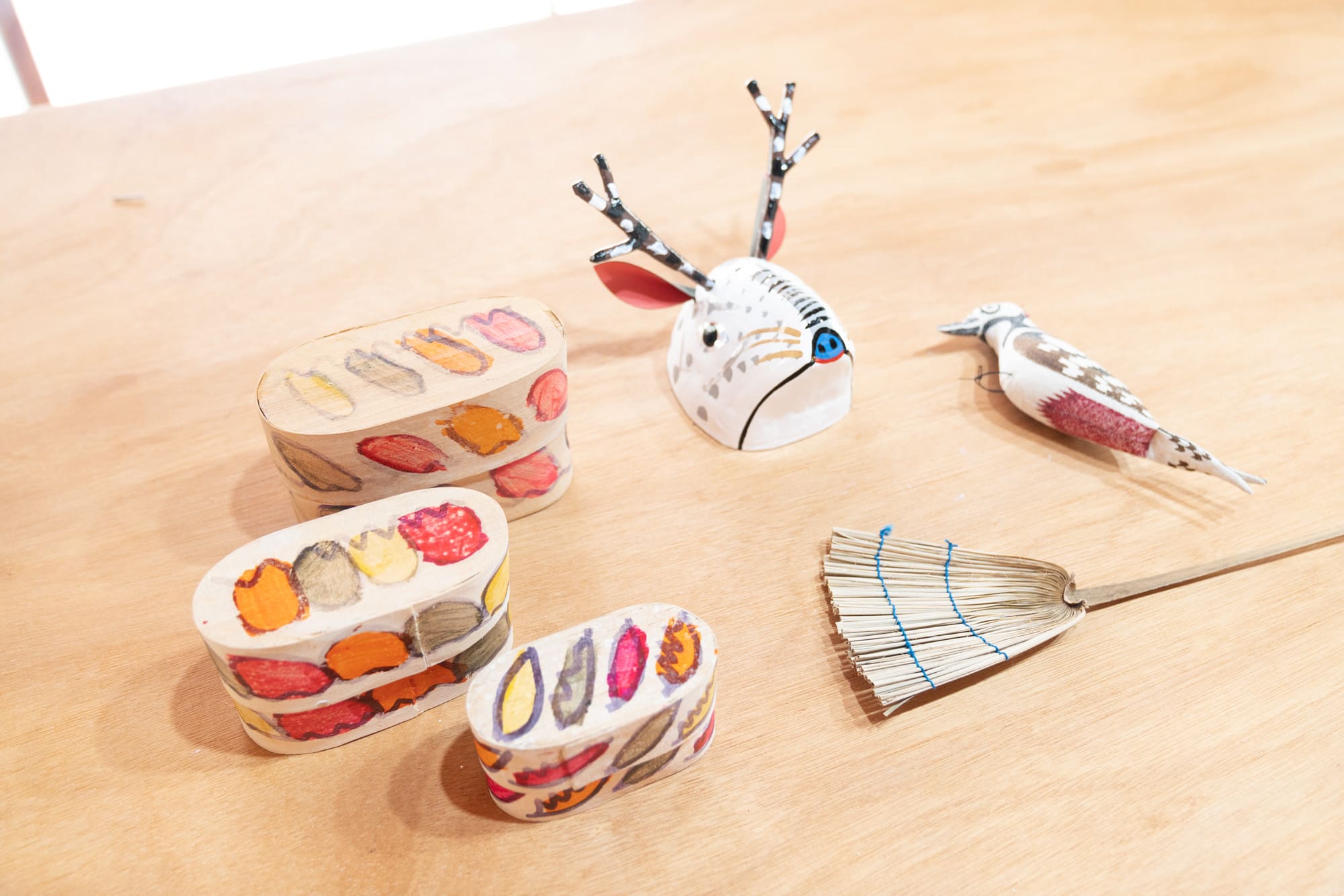 鹿のお面に、キツツキのぬいぐるみ……。