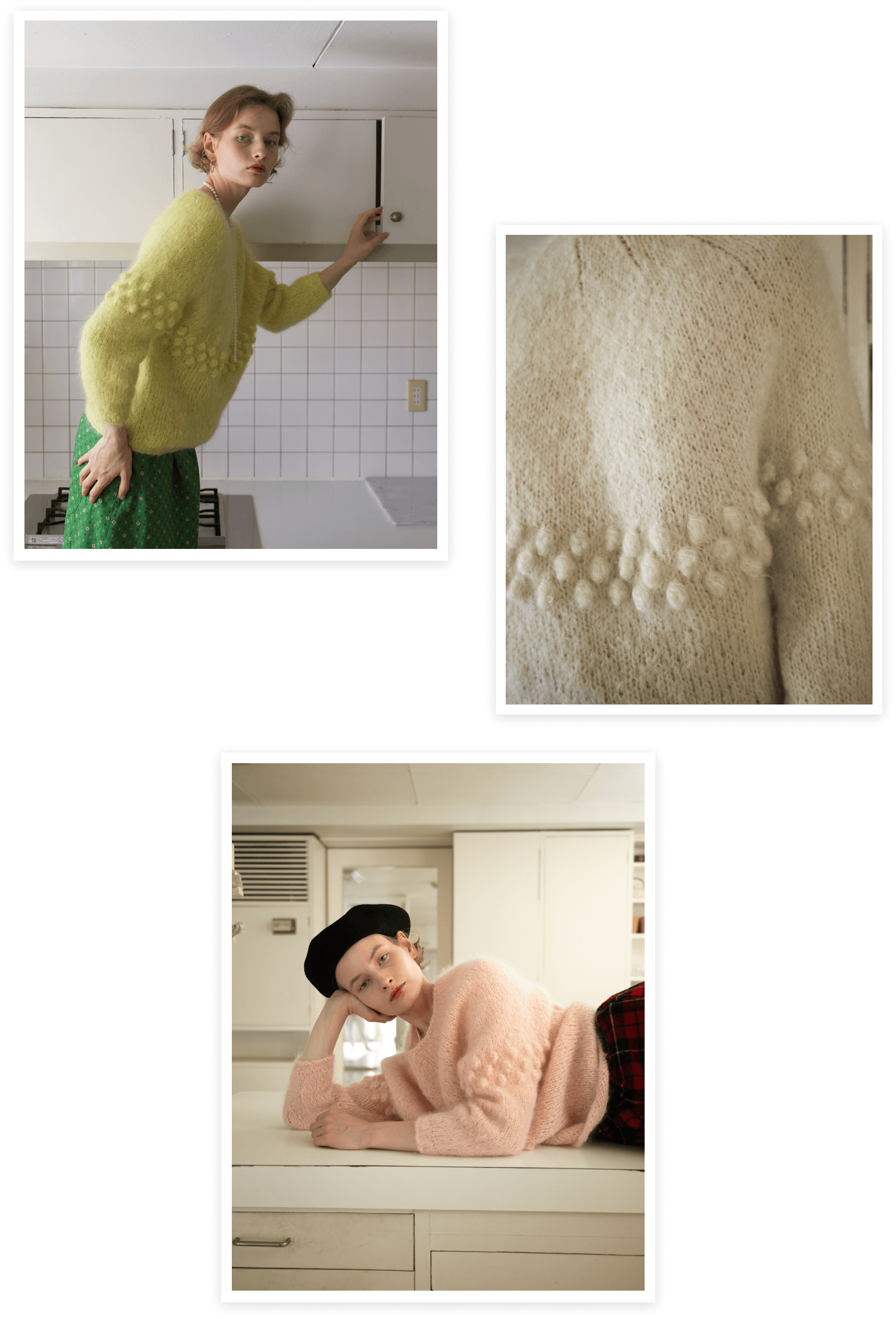 太番手のモヘア糸で編んだ、ほわっとした風合い。