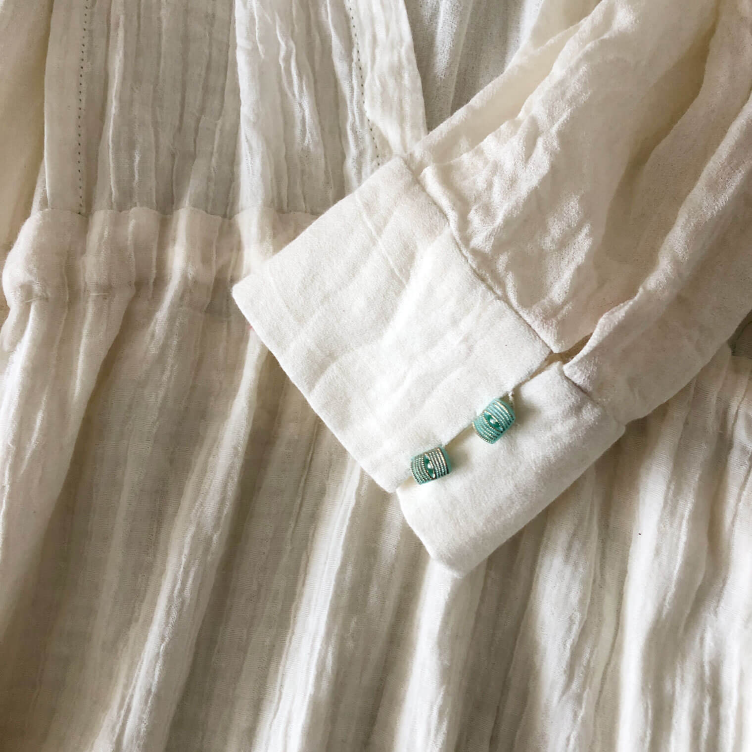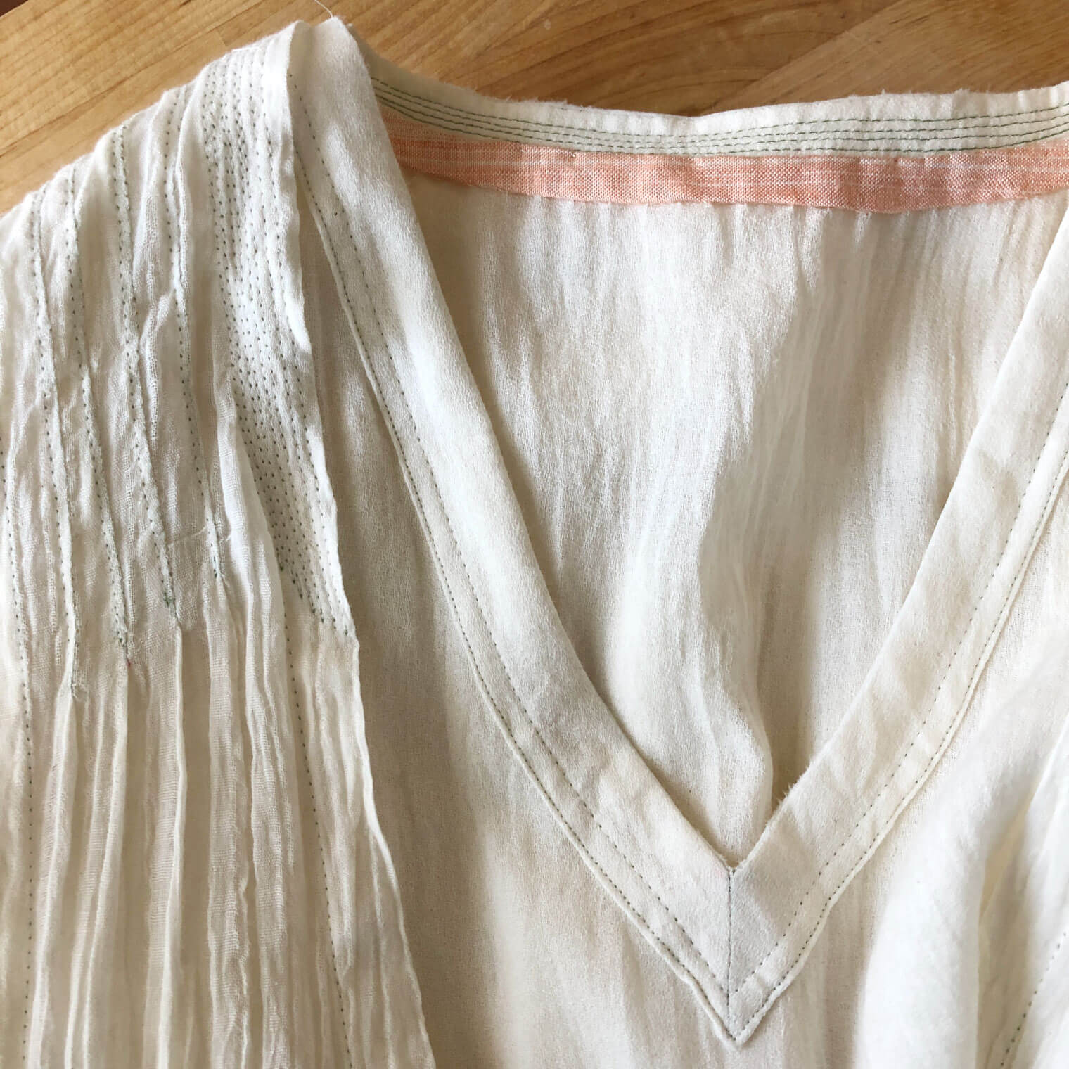 肩や衿まわりのステッチは、下糸に緑の糸をつかって