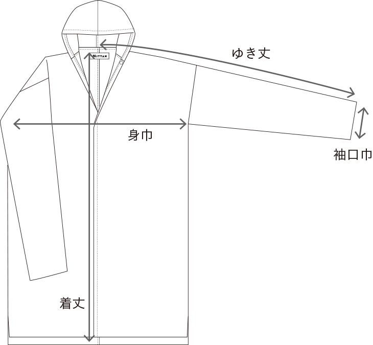 着丈 ゆき丈 身巾 袖口巾 1 95.5cm 80cm 51cm 13cm 2 100cm 84.5cm 54cm 14cm 3 105cm 88.5cm 56.5cm 14.5cm