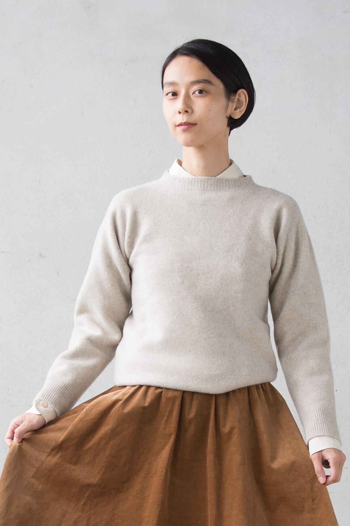 控えめなカーブの、ガンジーセーターのような襟ぐり。