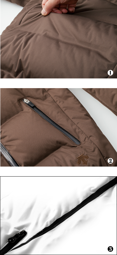 水沢ダウンは、3つの防水加工で、水の浸入をふせぎます。