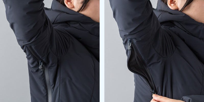 脇下のジッパーの開け閉めで、温度調節が可能です。