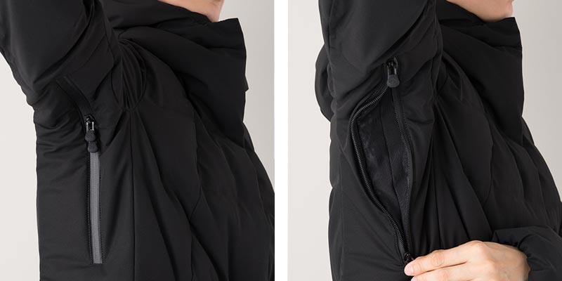 脇下のジッパーの開け閉めで、温度調節が可能です。