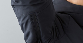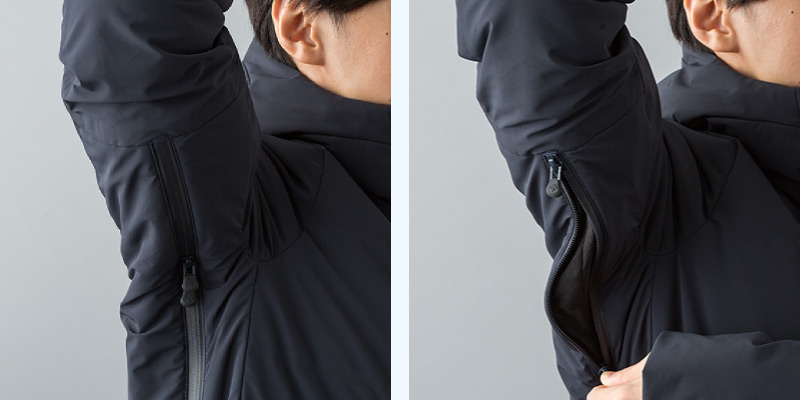 脇下のジッパーの開け閉めで、温度調節が可能です。