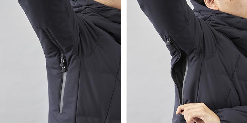 脇下のジッパーの開け閉めで、温度調節が可能です。