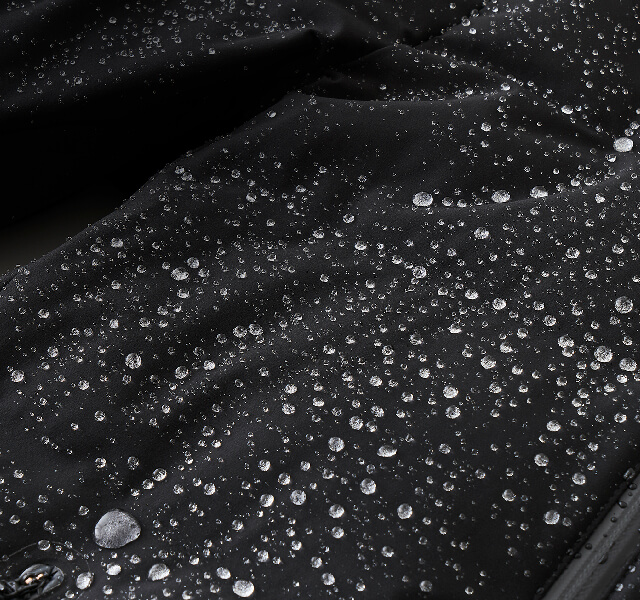生地表面の強力はっ水加工、裏面の透湿防水膜加工など、