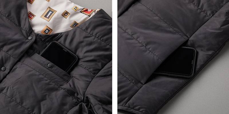 リバーシブル仕様のため、ブランドタグは脇ポケットの中に