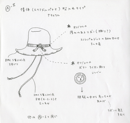 | 西海さん | ええと‥‥順番としては、 ちょっと待ってくださいね、 いま、工程順に帽子を並べてみますので。 (並べる)‥‥こんな具合でしょうか。 |