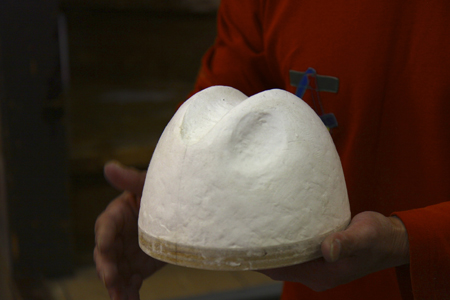| 西海さん | そうしたら、スソさんの木型に入れて、 クラウンの形をつくります。 ちょうどいま、乾かしているところなので 木型をはずしてお見せできないのですが‥‥。 |