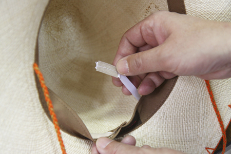 | 西海さん | 帽子の内側に 「スベリ」と呼ばれるテープをつけます。 これも今回のためにつくったオリジナルなんですよ。 |