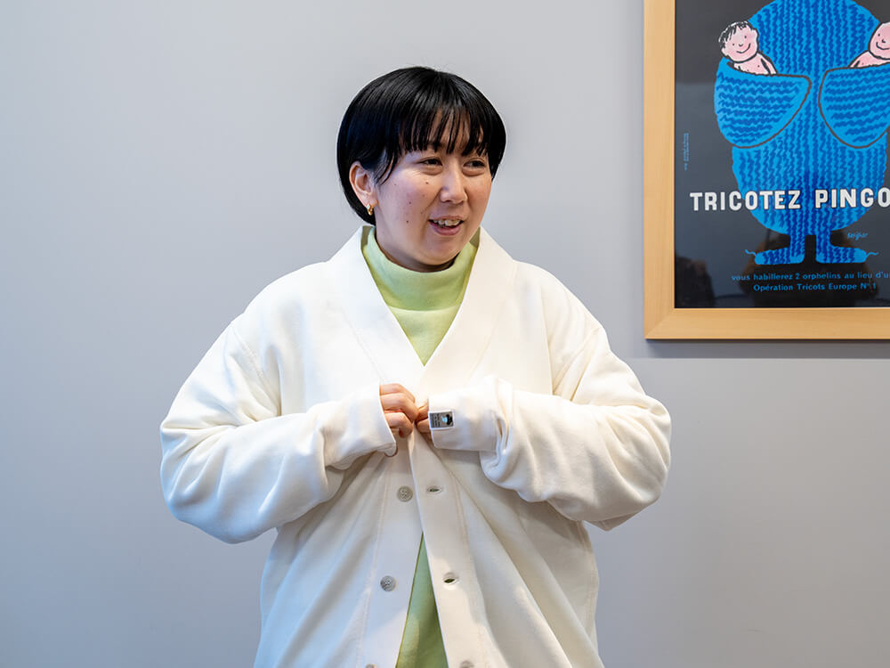 という素材でかわいくデザインしたのが、この「ねむくま」のカーディガン‥‥。