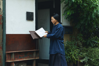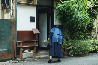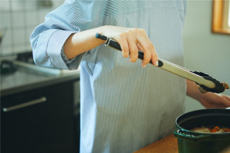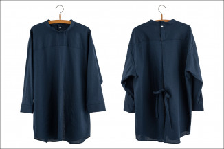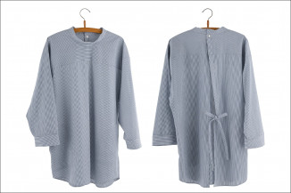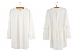後ろ姿は、2か所とめるだけの割烹着スタイル。