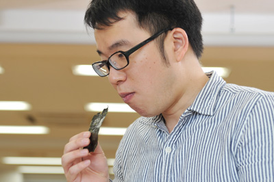 | 相沢 | 歯ごたえ、ぼくら「バリ感」というんですが、 これが他の海苔と違う。 であるけれども、 シャリときちんとマッチングして、 後味がある点かなと思います。 |