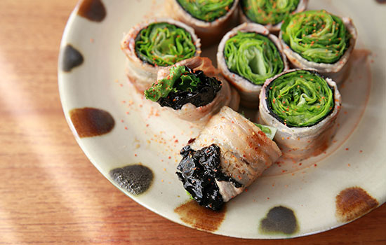 万能ネギ、きゅうり、なめろうを包んで食べます。