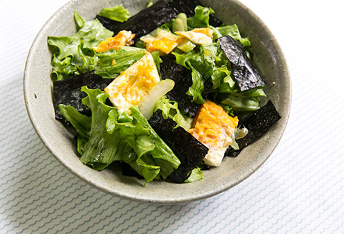 ボウルにちぎったグリーンリーフと目玉焼きを入れて、
