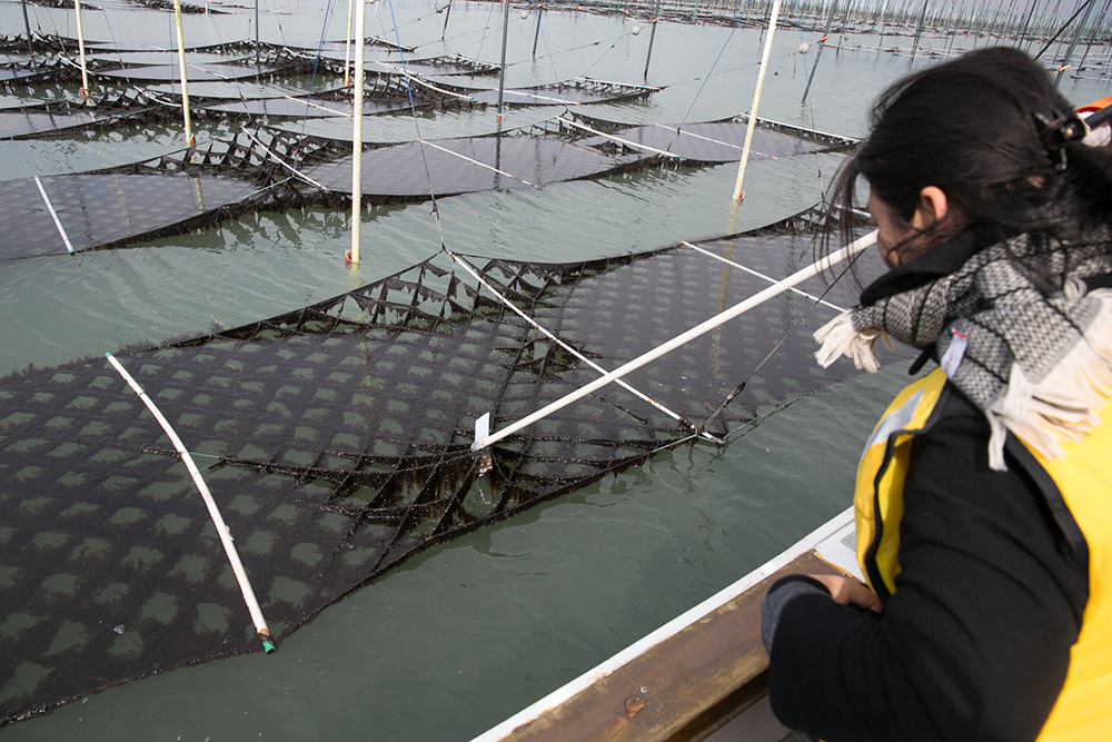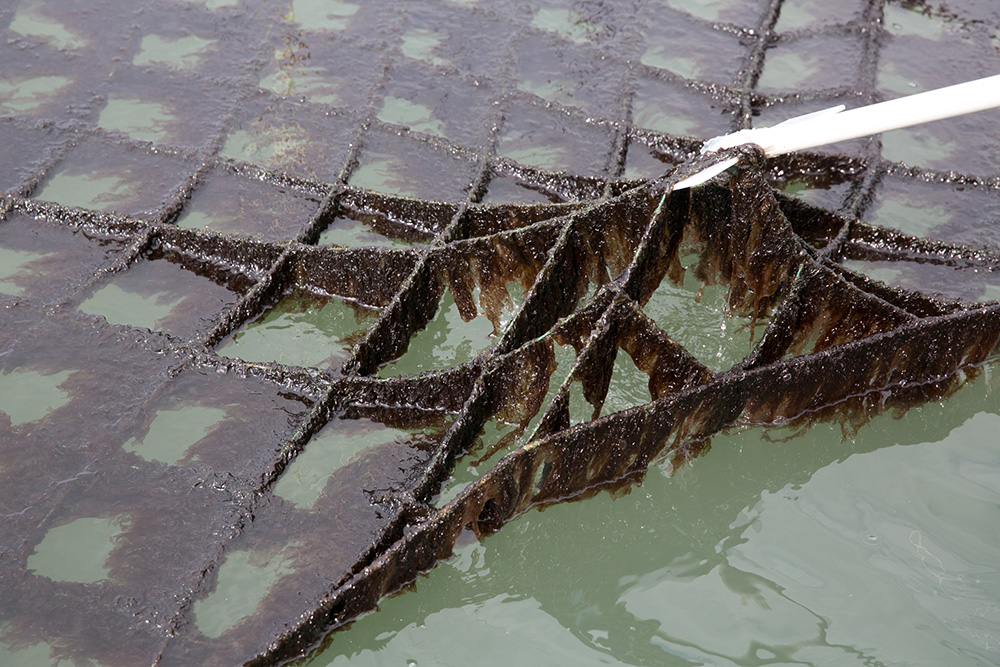 良い具合に成長した海苔の網を一部引き上げて