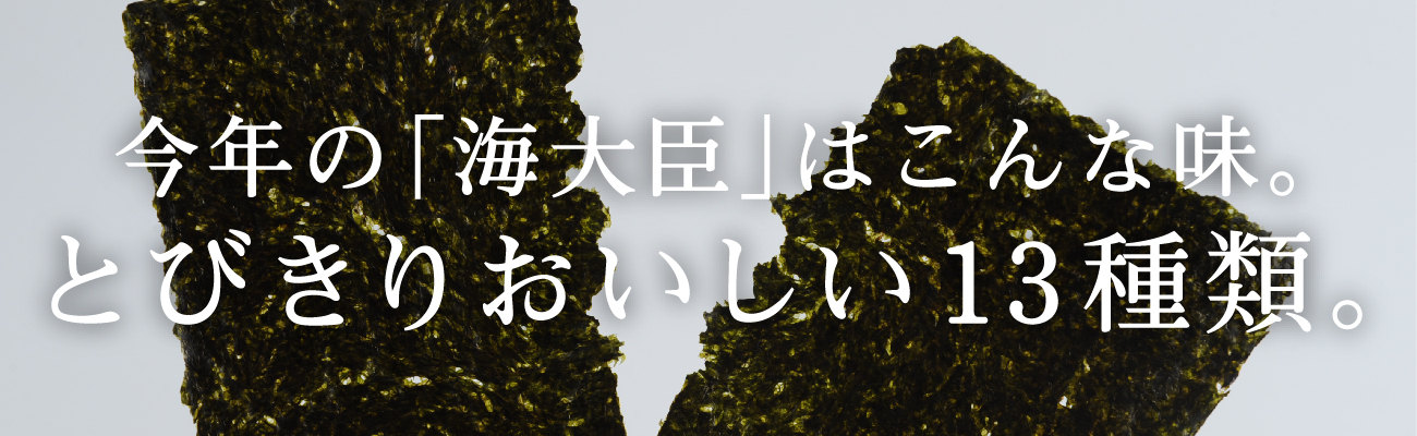 全国的な不作と言われている今年の海苔。 でも「海大臣」は、よい縁と運にめぐまれ、 いつもどおり、おいしい海苔があつまりました。 夏と冬、13種類をおとどけします。