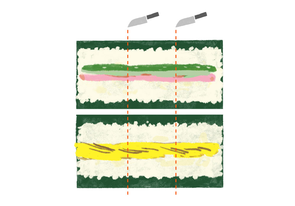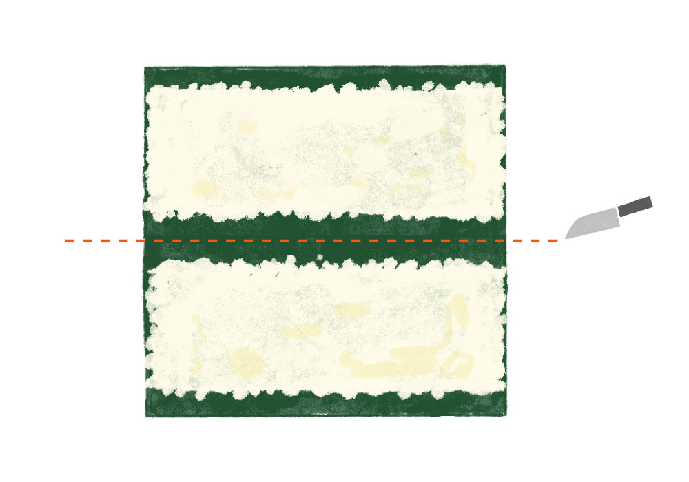 たてに3等分に切り、くるっと巻いて仕上げます。