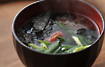 豆腐1丁を4等分し、かつおだしであたため、みそをといてみそ汁をつくる。