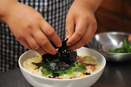 ごはんを盛り、茶こしで漉した2を注ぎ、1膳に対し、1/2枚の海苔を千切りにした海苔、