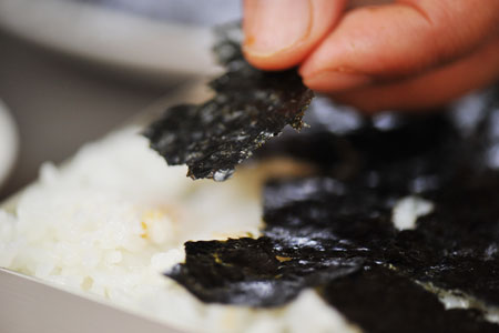 さらに上からごはんをのせ、同じように、海苔をのせてできあがり。