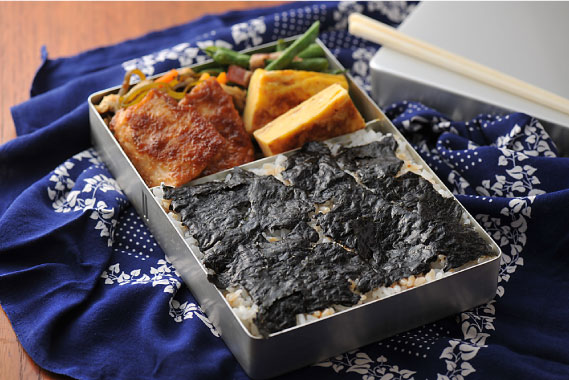 海苔をちぎって、おしょうゆをつけて 2段に敷き詰めた海苔弁当です。 さめても、おいしくいただけますよ。