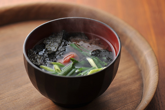 そこに海苔1/2枚をちぎってのせ、みそ汁を注ぐ。