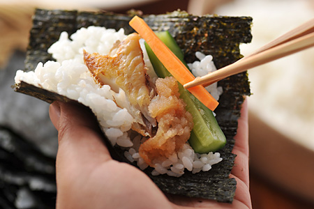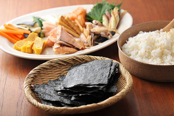 ふつうの酢飯でもなく、お刺し身も使わない、 ふだんの材料でつくることができる簡単手巻き寿司です。 ごま油のかおりが食欲をそそりますよ。 お好きなものをのせて巻いて、おめしあがりくださいね。