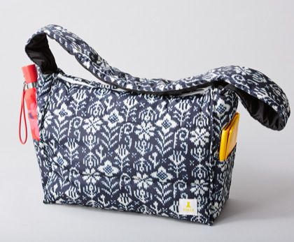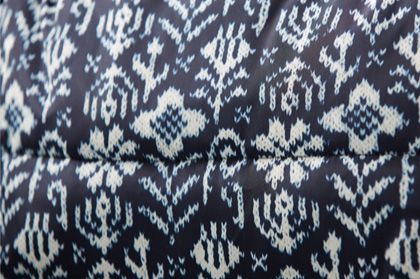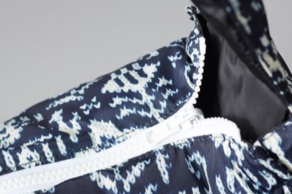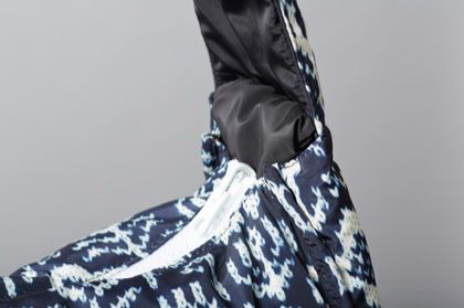 こんどのふわふわバッグは、KUKKAサイドが、 「ほぼ日の水沢ダウン2013」でも使われた、 三國万里子さんの「花のマリコメッコ」柄です。 濃紺にアイボリーの花模様が、キュート! 北欧っぽい、おしゃれなムードもあって、 今回は、こっちメインで使う人も多いかもしれませんね。 |