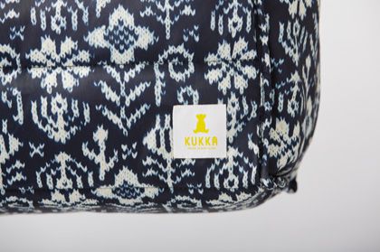 kUKKAサイドについている織りネームは、 「花のマリメッコ」柄と相性のいい黄色にしました。 濃紺とアイボリーの柄に、黄色の差し色が効いています。 |