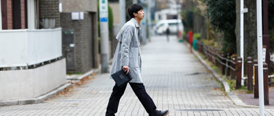 コート ¥63,000、デニムパンツ ¥17,850/ ともにヤエカ(ヤエカ アパートメント ストア) シャツ ¥26,250/アシードンクラウド(ハバダッシュリー 新潟三越店) シューズ ¥71,400/ベストパッキングストア