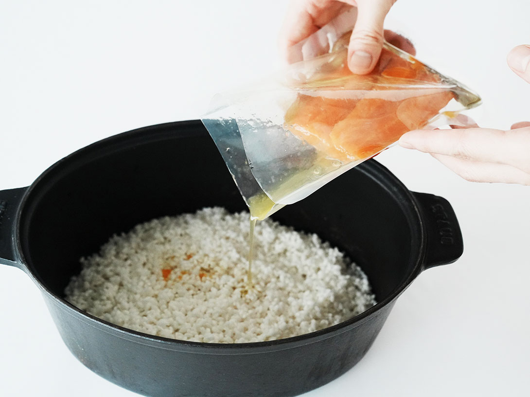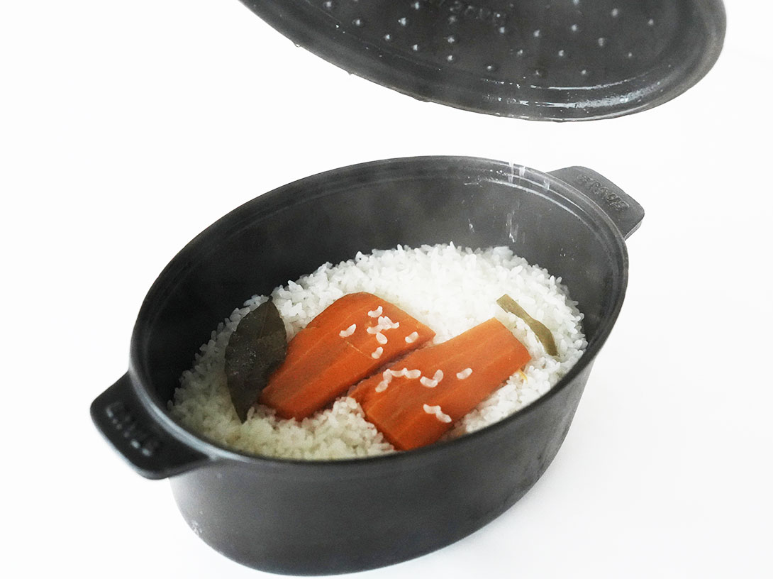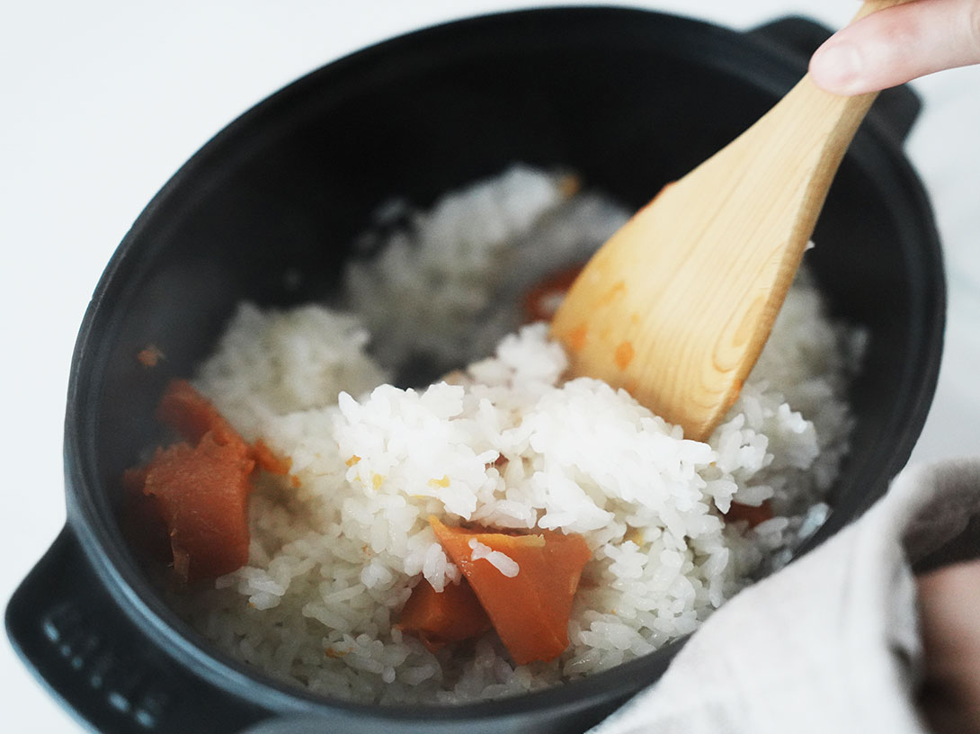 炊飯器で炊いたものをル・クルーゼ的な鍋に入れて、
