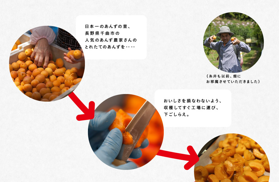 日本一のあんずの里、長野県千曲市の人気のあんず農家さんのとれたてのあんずを‥‥(糸井も以前、畑にお邪魔させていただきました) → おいしさを損なわないよう、収穫してすぐ工場に運び、下ごしらえ。(一緒に作っているのはジャム作りのプロフェッショナル「サンクゼール」さん!) → だいじな工程のひとつ、めずらしい「オーブンドライ加工」。工場のかたが、時間をかけて行ってくれています。 → そのほか砂糖と合わせて寝かせたり、味を見ながら煮方を調整したり。細部まで、いろんな工夫をしています。 → 殺菌・消毒を経て、ラベルを貼り、完成!
