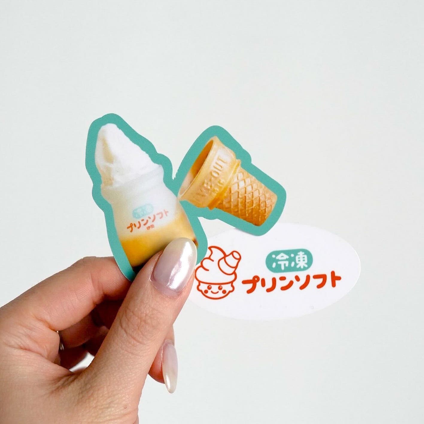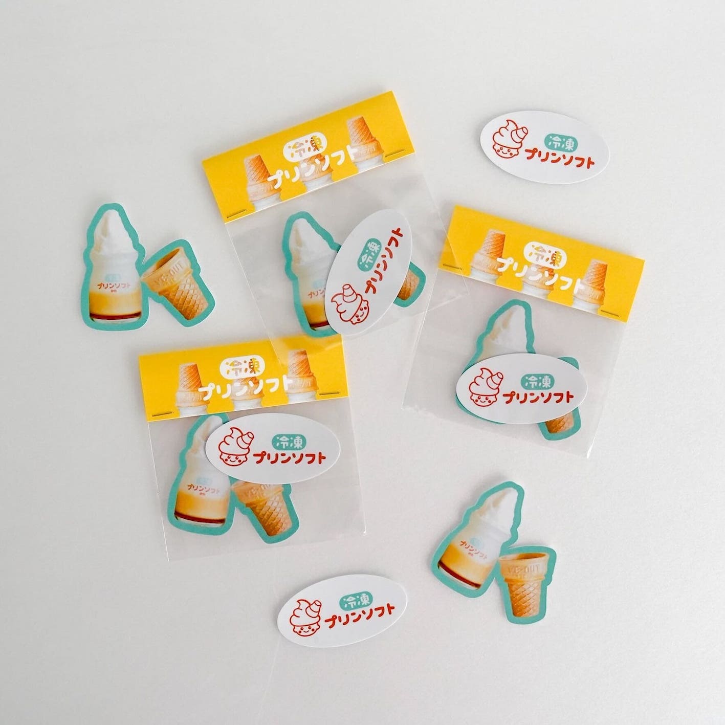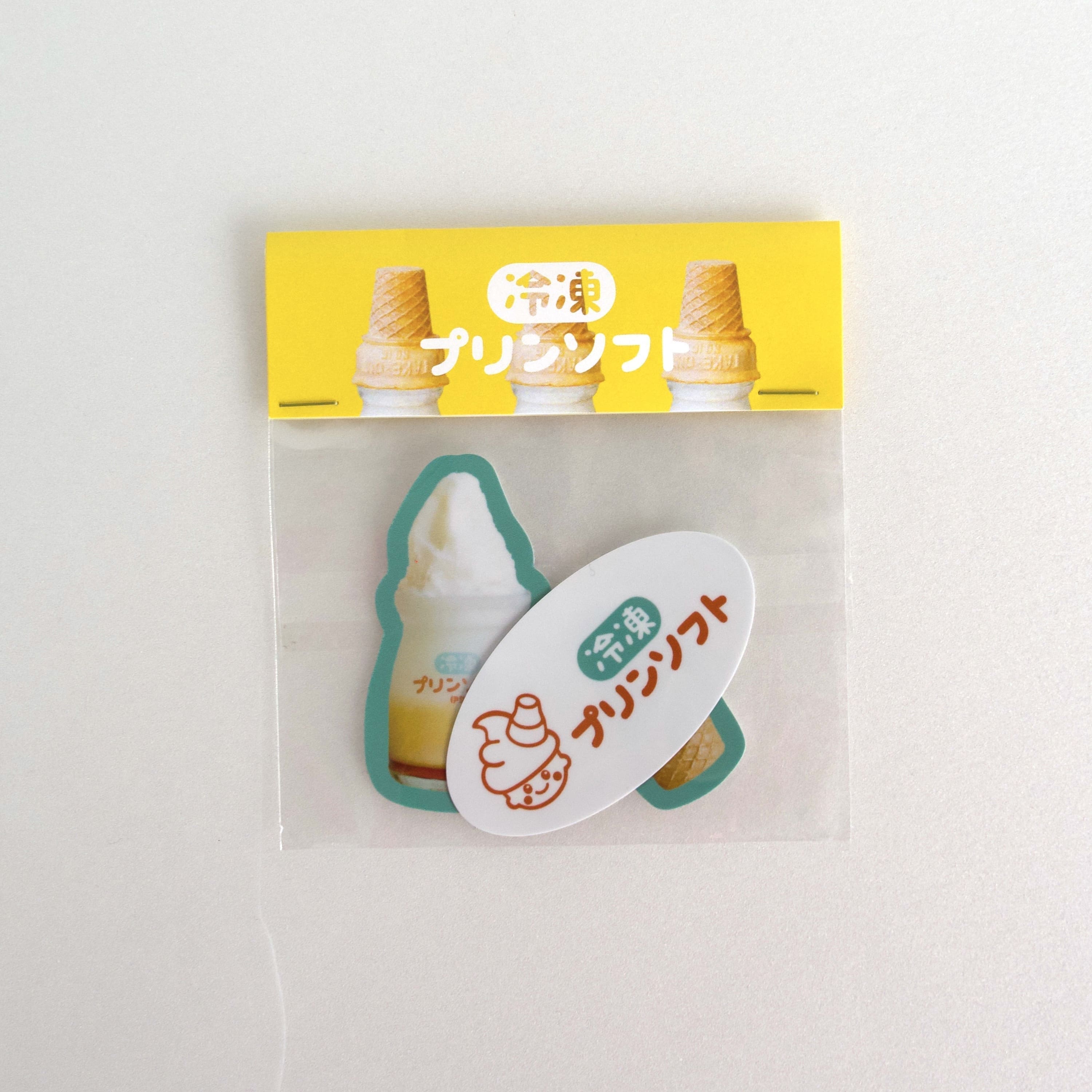 かわいらしい見た目の冷凍プリンソフトと、ロゴの2枚セット。