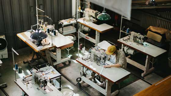 大型のテント用のミシンを使ってつくられるバッグは、