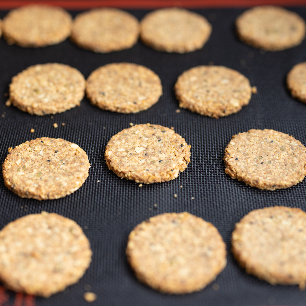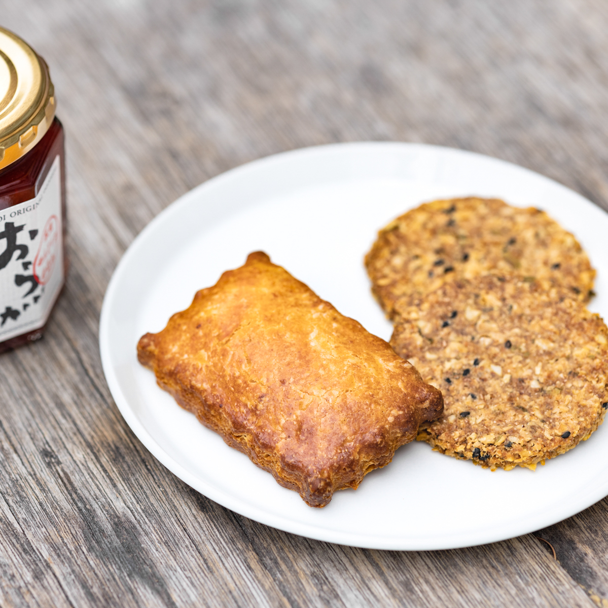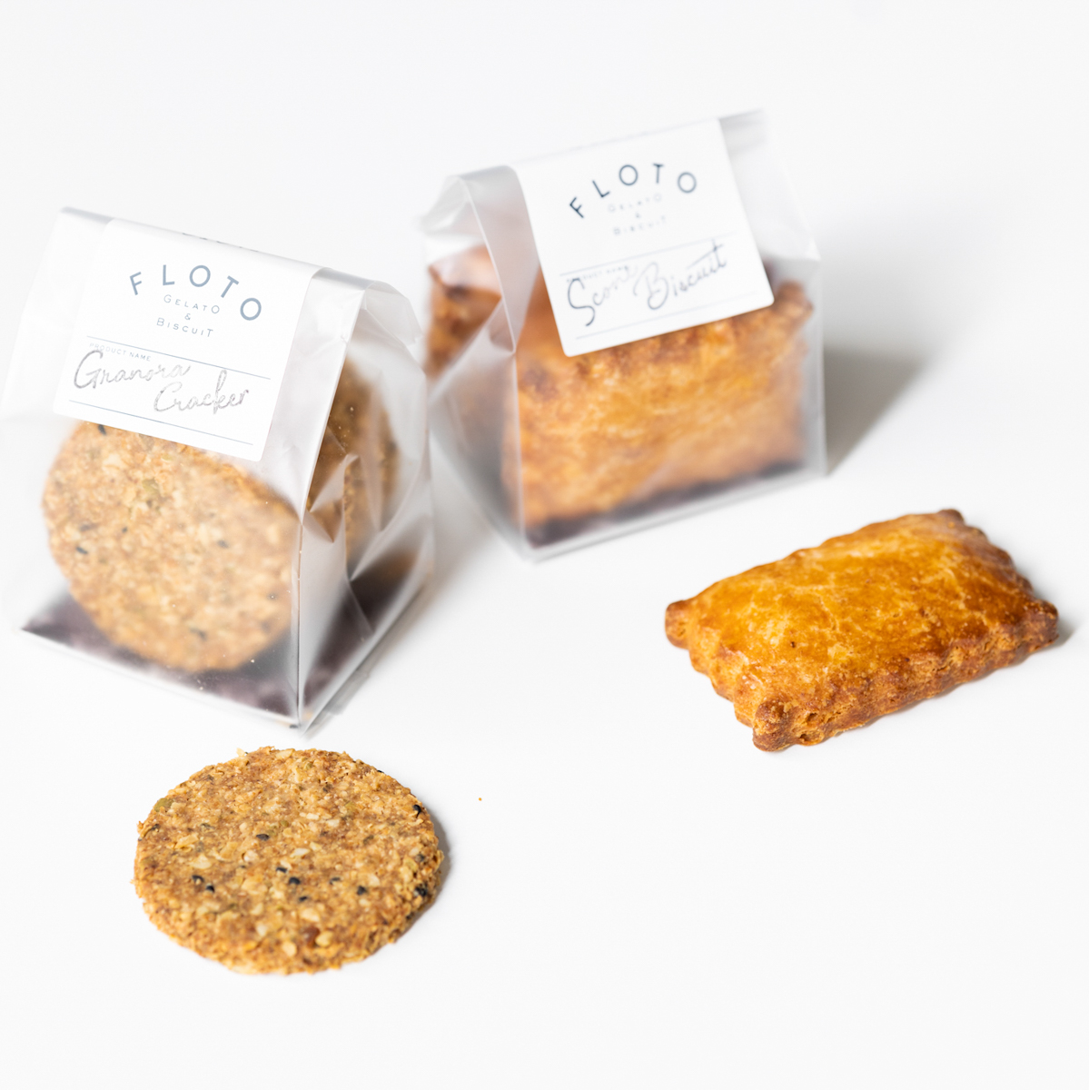 グラノーラクラッカー:有機オーツ麦(アメリカ産)、全粒粉、カボチャの種、メープルシロップ、バター、ごま油、黒胡麻、塩