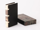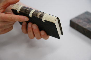 <本体> 台紙:カルトン 背表紙バンド部分:山羊革、羊皮紙 背表紙バンド以外の部分:ヘビ革 花切れ:山羊革 花切れの芯:Batonnet テキスト本文紙:アルシュ・ベラン 見返し紙:マーブル紙 (フランスのマーブル作家 Perry Katalinによるハンドメイドの作品)、 遊び紙:越中染め紙