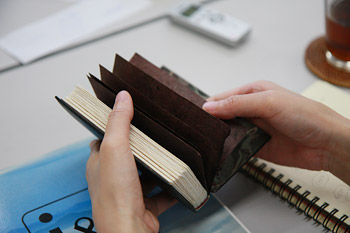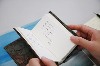 <その他> テキストを綴じつける時の糸:寒冷紗、雁皮紙薄口、麻糸 羊皮紙 フランス語でCarte Bulle(カルト・ビュル)と呼ばれる 柔らかな紙 クラフト紙 ヴェルジェ紙など洋紙 黒谷晒し6匁の和紙など複数種類の紙。 糊 ワックス (エチュイの表面のマーブル紙は、 自然界の原料からできた 安全なワックスを塗っています) ロウ (「一詩一冊本」本体の天や本をかがる 際の糸を 「ろう引き」しています) |