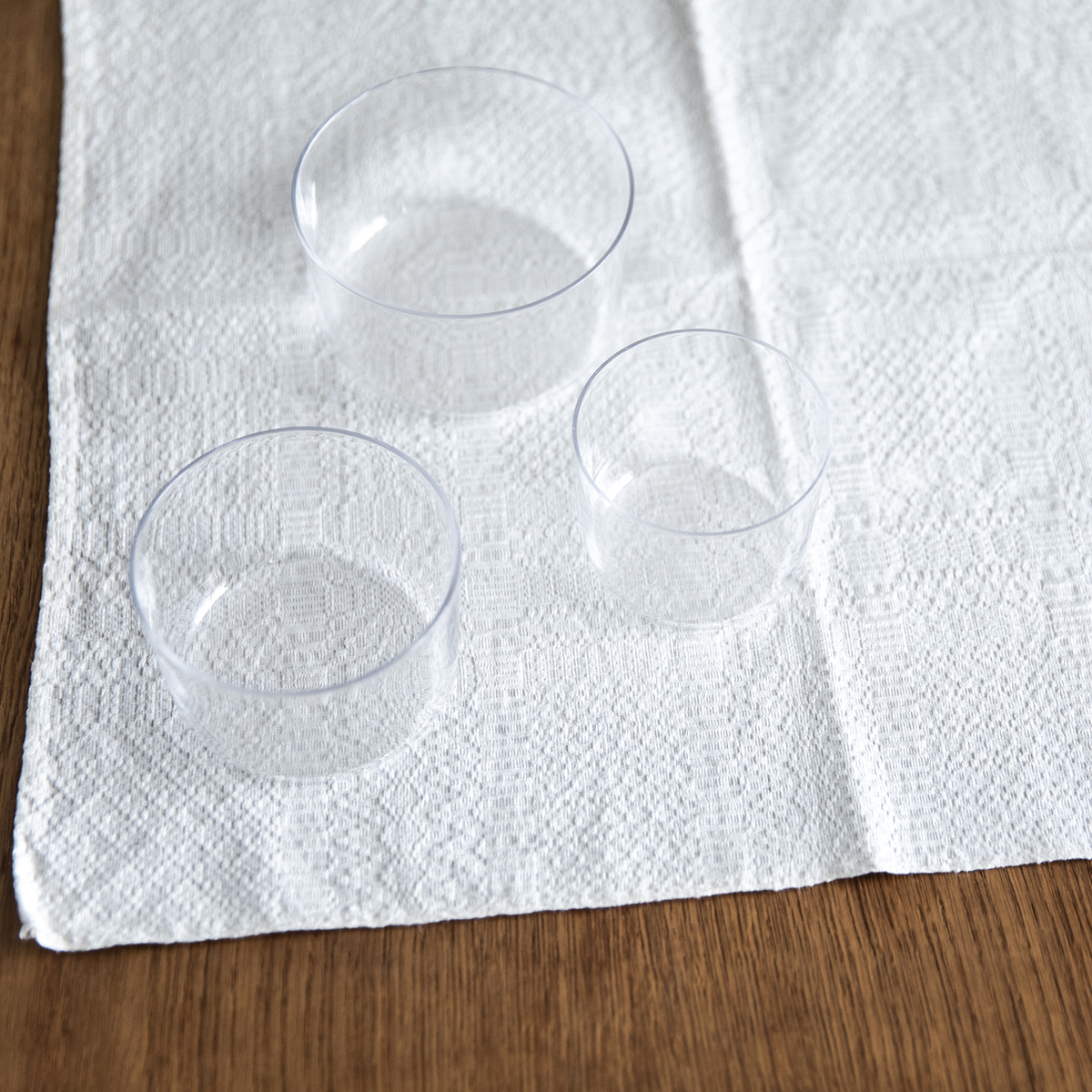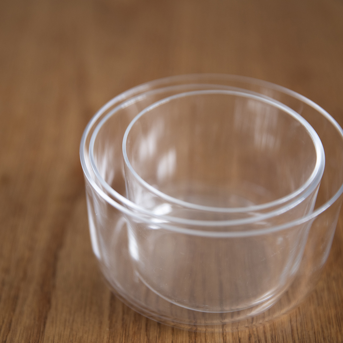 ・グラスを積み重ねると、破損の原因になり、また、外れなくなることがあります。ガラスのうつわ(小・中・大)は1つずつでしたら重ねて収納することができますが、同じ大きさのものを重ねることはおやめください。また、ほかのうつわとも積み重ねないでください。やむを得ず重ねる時は、グラスの間に柔らかい紙などを間に挟んでください。