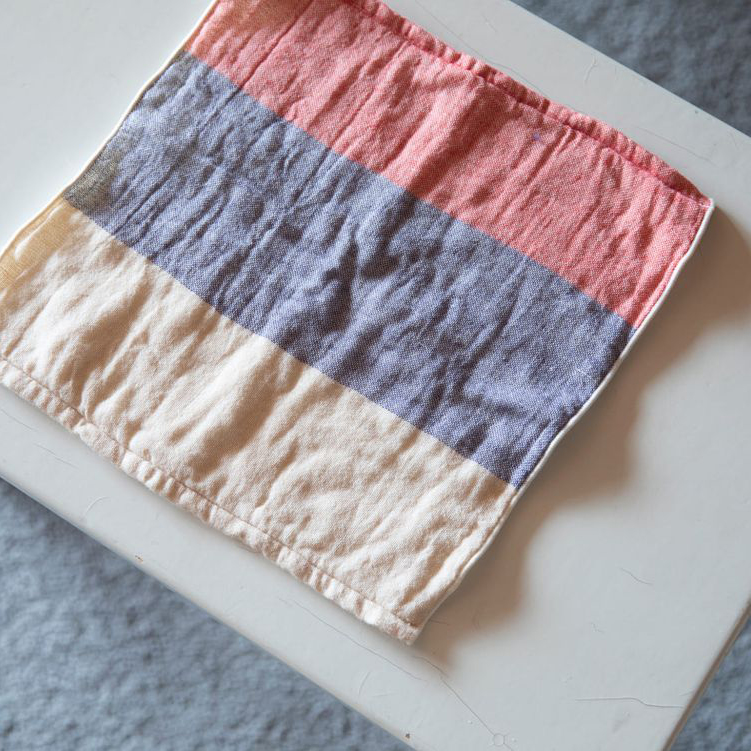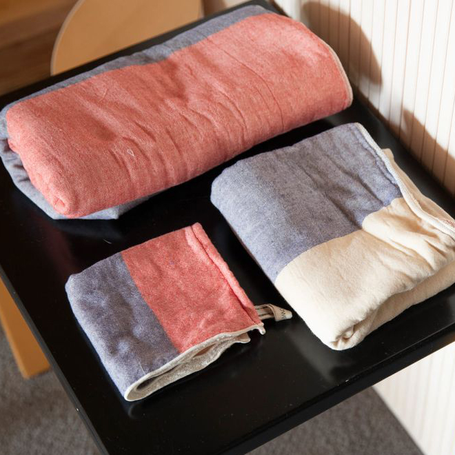 ・3重の織構造のため、両面パイルのタオルよりも薄くて軽いです。その3つの層を、接結糸とよばれる糸でつないでいるため、ガーゼ面には等間隔に小さなへこみがあります。