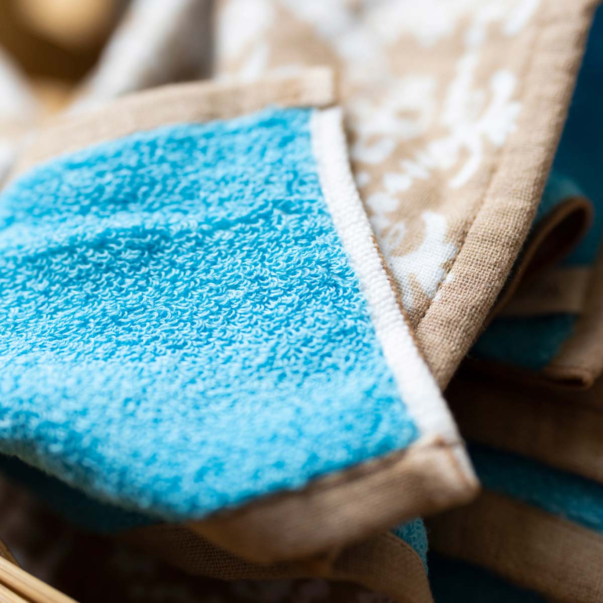 ・プリントのタオルは、使い始めに色落ちしたり、染料のニオイがすることがあります。白物と一緒に洗わないでください。